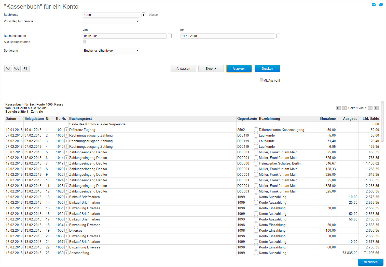 Anders als bei einem herkömmlichen Kontenblatt werden die Soll- und Habenbuchungen des betreffenden Kontos in diesem Report - wie bei einem Kassenbuch üblich - als Ein- und Ausgaben dargestellt. Die erste Zeile der Auswertungstabelle enthält zudem den aus der jeweiligen Vorperiode stammenden Kontosaldo.